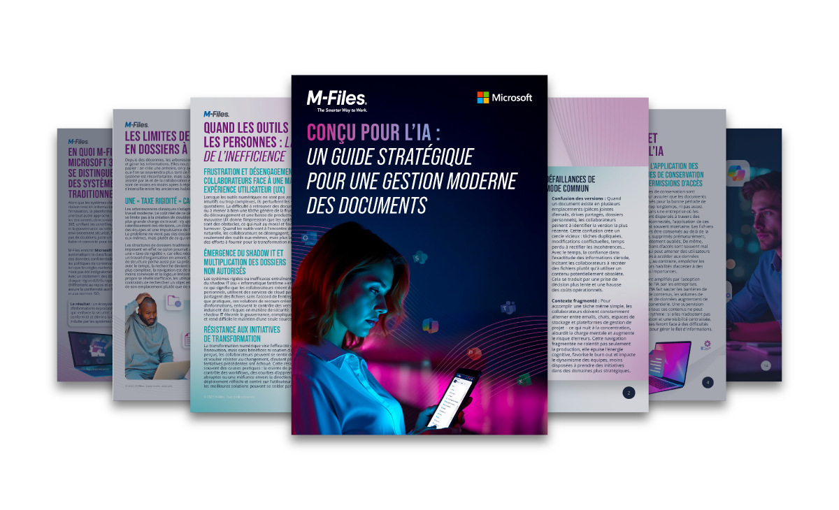 Les organisations dépendent de Microsoft pour la collaboration et la communication, mais la dispersion des contenus, les processus manuels et les systèmes déconnectés continuent de ralentir le travail et d'augmenter les risques de non-conformité. Conçu pour l'IA : un guide stratégique pour la gestion moderne des documents montre comment M-Files l'environnement Microsoft en unifiant les informations, en automatisant la gouvernance, en enrichissant les métadonnées et en préparant les données connectées pour l'IA. Il en résulte des flux de travail plus rapides, une meilleure visibilité, moins de tâches routinières et une sécurité et une conformité renforcées dans toute l'entreprise.
